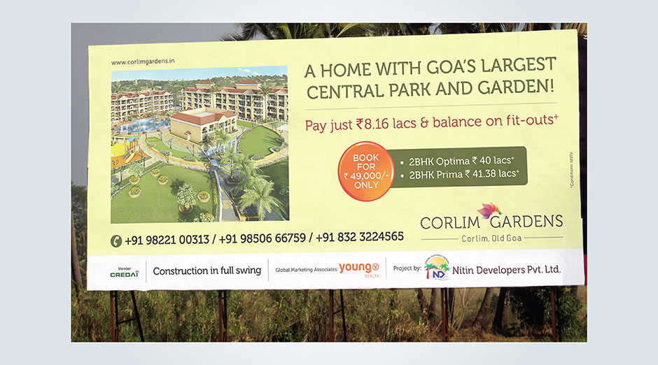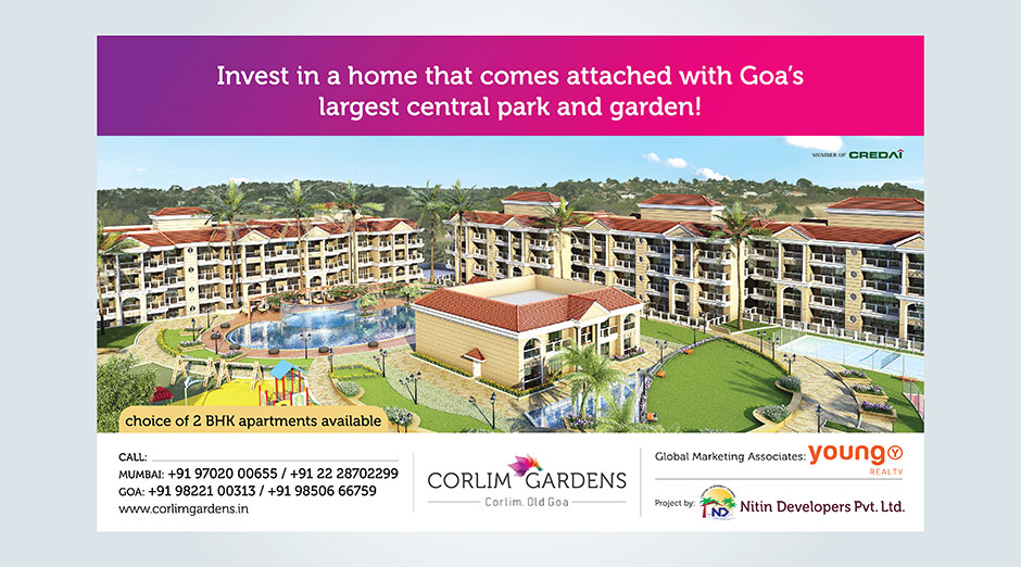 Based on the brand philosophy created for Nitin Developers Pvt. Ltd., the communication of Corlim Gardens is a natural extension of the successfully completed Socorro Gardens. The vibrancy is again visible in the logo of Corlim Gardens. Similar to Socorro Gardens, YOUNG is also mandated with the duties of taking over the entire sales responsibility for this development.